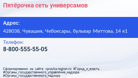 Пятёрочка, сеть универсамов по адресу 428038, Чувашия, Чебоксары, бульвар Миттова, 14 к1 в дальнейшем Организация, размещена в следующих категориях: