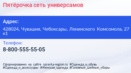 Пятёрочка, сеть универсамов по адресу 428024, Чувашия, Чебоксары, Ленинского Комсомола, 27 к1 в дальнейшем Организация, размещена в следующих категориях: