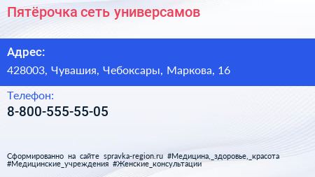 Пятёрочка, сеть универсамов по адресу 428003, Чувашия, Чебоксары, Маркова, 16 в дальнейшем Организация, размещена в следующих категориях: