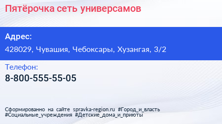 Пятёрочка, сеть универсамов по адресу 428029, Чувашия, Чебоксары, Хузангая, 3/2 в дальнейшем Организация, размещена в следующих категориях: