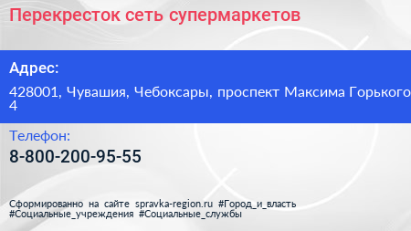 Перекресток, сеть супермаркетов по адресу 428001, Чувашия, Чебоксары, проспект Максима Горького, 4 в дальнейшем Организация, размещена в следующих категориях: