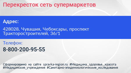 Перекресток, сеть супермаркетов по адресу 428028, Чувашия, Чебоксары, проспект Тракторостроителей, 36/1 в дальнейшем Организация, размещена в следующих категориях:
