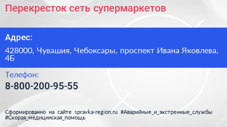 Перекресток, сеть супермаркетов по адресу 428000, Чувашия, Чебоксары, проспект Ивана Яковлева, 4Б в дальнейшем Организация, размещена в следующих категориях: