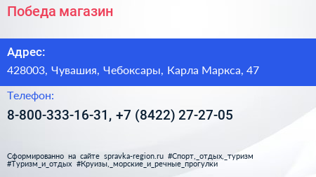 Победа, магазин по адресу 428003, Чувашия, Чебоксары, Карла Маркса, 47 в дальнейшем Организация, размещена в следующих категориях: