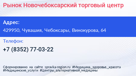 Рынок Новочебоксарский, торговый центр по адресу 429950, Чувашия, Чебоксары, Винокурова, 64 в дальнейшем Организация, размещена в следующих категориях: