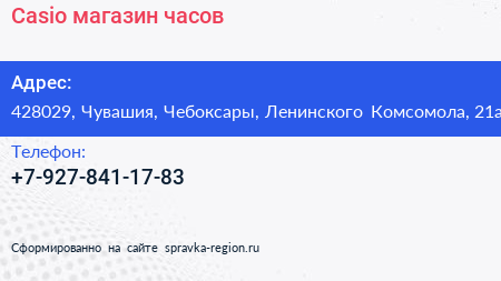 Сasio, магазин часов по адресу 428029, Чувашия, Чебоксары, Ленинского Комсомола, 21а в дальнейшем Организация, размещена в следующих категориях: