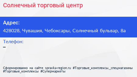 Солнечный, торговый центр по адресу 428028, Чувашия, Чебоксары, Солнечный бульвар, 8а в дальнейшем Организация, размещена в следующих категориях: