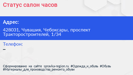 Статус, салон часов по адресу 428031, Чувашия, Чебоксары, проспект Тракторостроителей, 1/34 в дальнейшем Организация, размещена в следующих категориях: