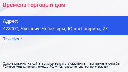 Времена, торговый дом по адресу 428000, Чувашия, Чебоксары, Юрия Гагарина, 27 в дальнейшем Организация, размещена в следующих категориях: