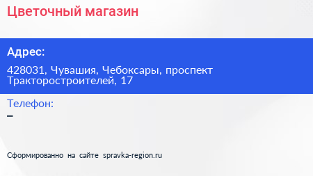 Цветочный магазин по адресу 428031, Чувашия, Чебоксары, проспект Тракторостроителей, 17 в дальнейшем Организация, размещена в следующих категориях: