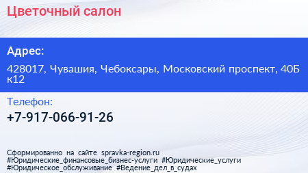 Цветочный салон по адресу 428017, Чувашия, Чебоксары, Московский проспект, 40Б к12 в дальнейшем Организация, размещена в следующих категориях: