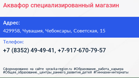 Аквафор, специализированный магазин по адресу 429958, Чувашия, Чебоксары, Советская, 15 в дальнейшем Организация, размещена в следующих категориях: