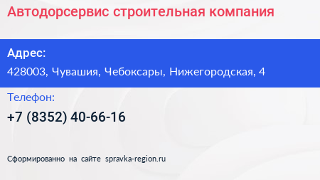Автодорсервис, строительная компания по адресу 428003, Чувашия, Чебоксары, Нижегородская, 4 в дальнейшем Организация, размещена в следующих категориях: