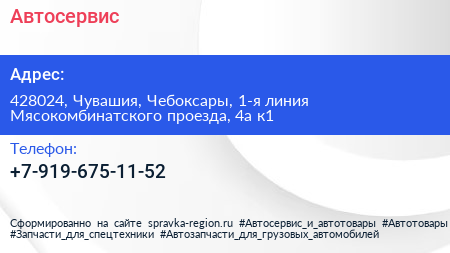 Автосервис по адресу 428024, Чувашия, Чебоксары, 1-я линия Мясокомбинатского проезда, 4а к1 в дальнейшем Организация, размещена в следующих категориях: