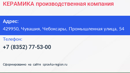 КЕРАМИКА, производственная компания по адресу 429950, Чувашия, Чебоксары, Промышленная улица, 54 в дальнейшем Организация, размещена в следующих категориях: