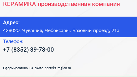 КЕРАМИКА, производственная компания по адресу 428020, Чувашия, Чебоксары, Базовый проезд, 21а в дальнейшем Организация, размещена в следующих категориях: