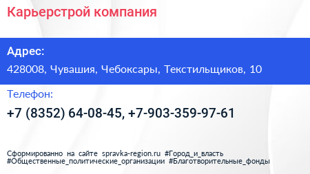 Карьерстрой, компания по адресу 428008, Чувашия, Чебоксары, Текстильщиков, 10 в дальнейшем Организация, размещена в следующих категориях: