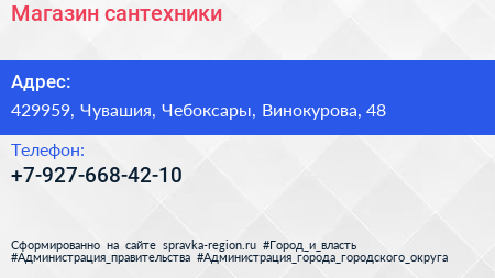 Магазин сантехники по адресу 429959, Чувашия, Чебоксары, Винокурова, 48 в дальнейшем Организация, размещена в следующих категориях: