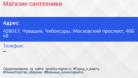 Магазин сантехники по адресу 428017, Чувашия, Чебоксары, Московский проспект, 40Б к8 в дальнейшем Организация, размещена в следующих категориях: