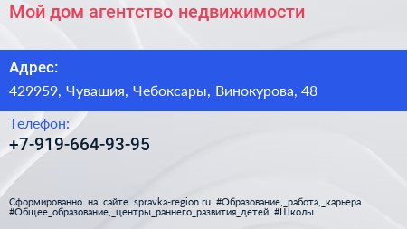 Мой дом, агентство недвижимости по адресу 429959, Чувашия, Чебоксары, Винокурова, 48 в дальнейшем Организация, размещена в следующих категориях: