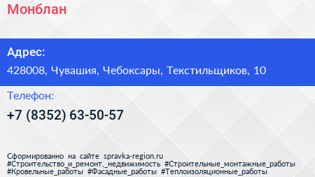 Монблан по адресу 428008, Чувашия, Чебоксары, Текстильщиков, 10 в дальнейшем Организация, размещена в следующих категориях: