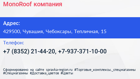 MonoRoof, компания по адресу 429500, Чувашия, Чебоксары, Тепличная, 15 в дальнейшем Организация, размещена в следующих категориях: