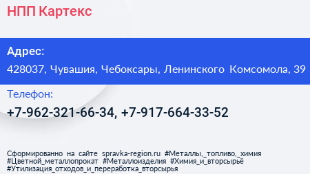 НПП Картекс по адресу 428037, Чувашия, Чебоксары, Ленинского Комсомола, 39 в дальнейшем Организация, размещена в следующих категориях: