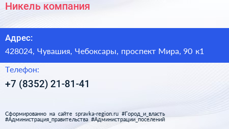 Никель, компания по адресу 428024, Чувашия, Чебоксары, проспект Мира, 90 к1 в дальнейшем Организация, размещена в следующих категориях: