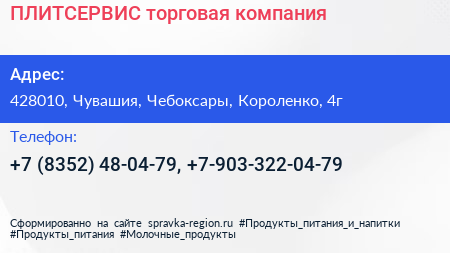 ПЛИТСЕРВИС, торговая компания по адресу 428010, Чувашия, Чебоксары, Короленко, 4г в дальнейшем Организация, размещена в следующих категориях: