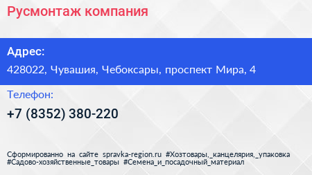 Русмонтаж, компания по адресу 428022, Чувашия, Чебоксары, проспект Мира, 4 в дальнейшем Организация, размещена в следующих категориях: