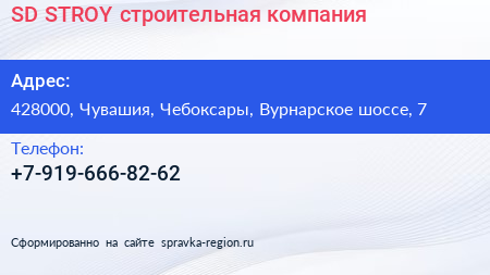 SD STROY, строительная компания по адресу 428000, Чувашия, Чебоксары, Вурнарское шоссе, 7 в дальнейшем Организация, размещена в следующих категориях:
