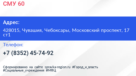 СМУ-60 по адресу 428015, Чувашия, Чебоксары, Московский проспект, 17 ст1 в дальнейшем Организация, размещена в следующих категориях: