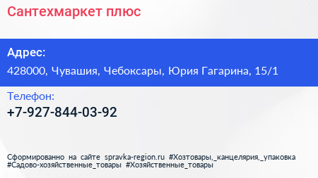 Сантехмаркет плюс по адресу 428000, Чувашия, Чебоксары, Юрия Гагарина, 15/1 в дальнейшем Организация, размещена в следующих категориях: