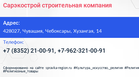 Сарэкострой, строительная компания по адресу 428027, Чувашия, Чебоксары, Хузангая, 14 в дальнейшем Организация, размещена в следующих категориях: