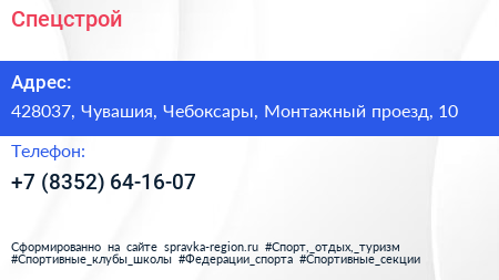 Спецстрой по адресу 428037, Чувашия, Чебоксары, Монтажный проезд, 10 в дальнейшем Организация, размещена в следующих категориях: