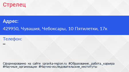 Стрелец по адресу 429950, Чувашия, Чебоксары, 10 Пятилетки, 17к в дальнейшем Организация, размещена в следующих категориях: