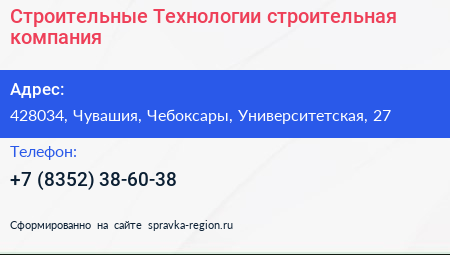 Строительные Технологии, строительная компания по адресу 428034, Чувашия, Чебоксары, Университетская, 27 в дальнейшем Организация, размещена в следующих категориях: