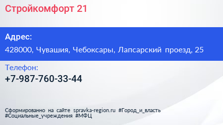 Стройкомфорт 21 по адресу 428000, Чувашия, Чебоксары, Лапсарский проезд, 25 в дальнейшем Организация, размещена в следующих категориях: