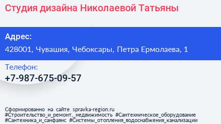 Студия дизайна Николаевой Татьяны по адресу 428001, Чувашия, Чебоксары, Петра Ермолаева, 1 в дальнейшем Организация, размещена в следующих категориях: