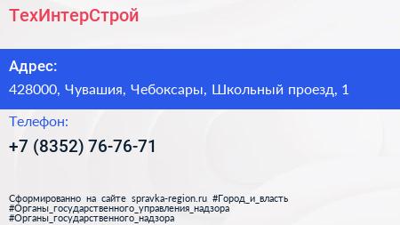 ТехИнтерСтрой по адресу 428000, Чувашия, Чебоксары, Школьный проезд, 1 в дальнейшем Организация, размещена в следующих категориях:
