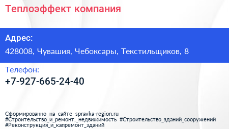 Теплоэффект, компания по адресу 428008, Чувашия, Чебоксары, Текстильщиков, 8 в дальнейшем Организация, размещена в следующих категориях: