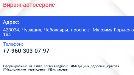Вираж, автосервис по адресу 428034, Чувашия, Чебоксары, проспект Максима Горького, 18а в дальнейшем Организация, размещена в следующих категориях: