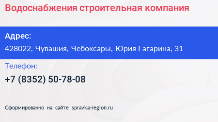 Водоснабжения, строительная компания по адресу 428022, Чувашия, Чебоксары, Юрия Гагарина, 31 в дальнейшем Организация, размещена в следующих категориях: