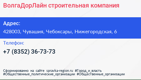 ВолгаДорЛайн, строительная компания по адресу 428003, Чувашия, Чебоксары, Нижегородская, 6 в дальнейшем Организация, размещена в следующих категориях: