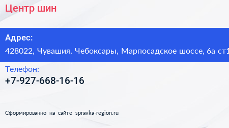Центр шин по адресу 428022, Чувашия, Чебоксары, Марпосадское шоссе, 6а ст1 в дальнейшем Организация, размещена в следующих категориях: