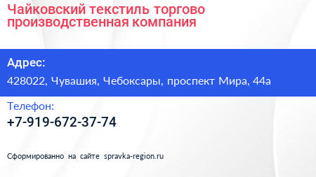Чайковский текстиль, торгово-производственная компания по адресу 428022, Чувашия, Чебоксары, проспект Мира, 44а в дальнейшем Организация, размещена в следующих категориях: