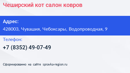 Чеширский кот, салон ковров по адресу 428003, Чувашия, Чебоксары, Водопроводная, 9 в дальнейшем Организация, размещена в следующих категориях: