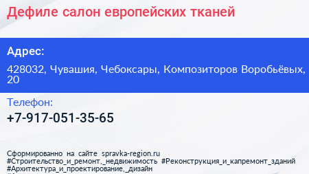 Дефиле, салон европейских тканей по адресу 428032, Чувашия, Чебоксары, Композиторов Воробьёвых, 20 в дальнейшем Организация, размещена в следующих категориях: