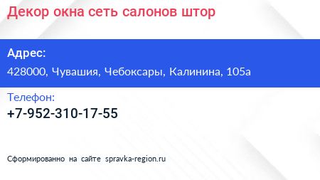 Декор окна, сеть салонов штор по адресу 428000, Чувашия, Чебоксары, Калинина, 105а в дальнейшем Организация, размещена в следующих категориях: