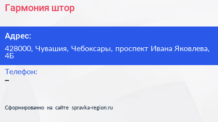 Гармония штор по адресу 428000, Чувашия, Чебоксары, проспект Ивана Яковлева, 4Б в дальнейшем Организация, размещена в следующих категориях: